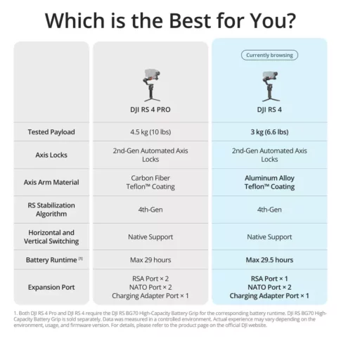 - The RS 4 battery grip features a cartridge design, making it easier to swap batteries and smaller for storage. It can even be charged separately from the gimbal. The new battery grip provides an extended runtime of up to 12 hours, enough for continuous shooting all day. It supports 18W PD fast charging with a charge time of just 2.5 hours. It can even be used while charging to keep RS 4 powered almost indefinitely.