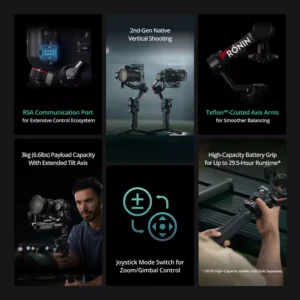 Enhanced operation efficiency, native vertical shooting, and an expanded accessory ecosystem make the DJI RS 4 a powerful tool for the mirrorless camera shooter. The gimbal only weighs around 2.4 lb and sports a load capacity of 6.6 lb capable of supporting your compact camera build. Teflon-coated axes reduce friction for a smoother balancing and operating experience. Other intuitive features include a fine-tuning knob, auto-locking OLED screen, and RSA communication port for use with expanded accessories.