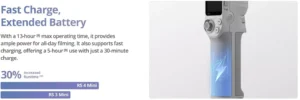 The RS 4 Mini battery grip contains a built-in 3100mAh battery that provides a runtime of up to 13 hours (fixed mode), generous enough for shooting all day.