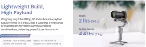 While the gimbal supports mirrorless camera rigs up to 4.4 lb, you can convert the RS 4 Mini into a smartphone gimbal with the optional Phone Holder. The phone holder offers more features and range of movement than a standard smartphone holder. The holder can also be used to monitor your camera image via the Ronin smartphone app.